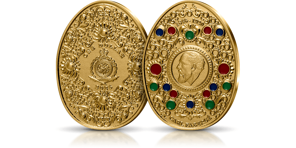 Innym przykładem może być imponująca moneta upamiętniająca 180. rocznicę urodzin Carla Fabergé. Emisja, również oferowana niegdyś przez Skarbnicę Narodową, została pokryta czystym złotem próby 999/1000, a dzięki antycznemu wykończeniu powierzchnia numizmatu jest odporna na działanie czynników zewnętrznych. Obecnie walor ten nie jest już dostępny w sprzedaży.